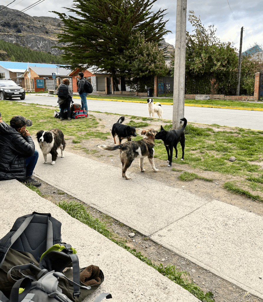 Dogs gather at the bus stop in Puerto Rio Tranquilo. These doggos are friendly.