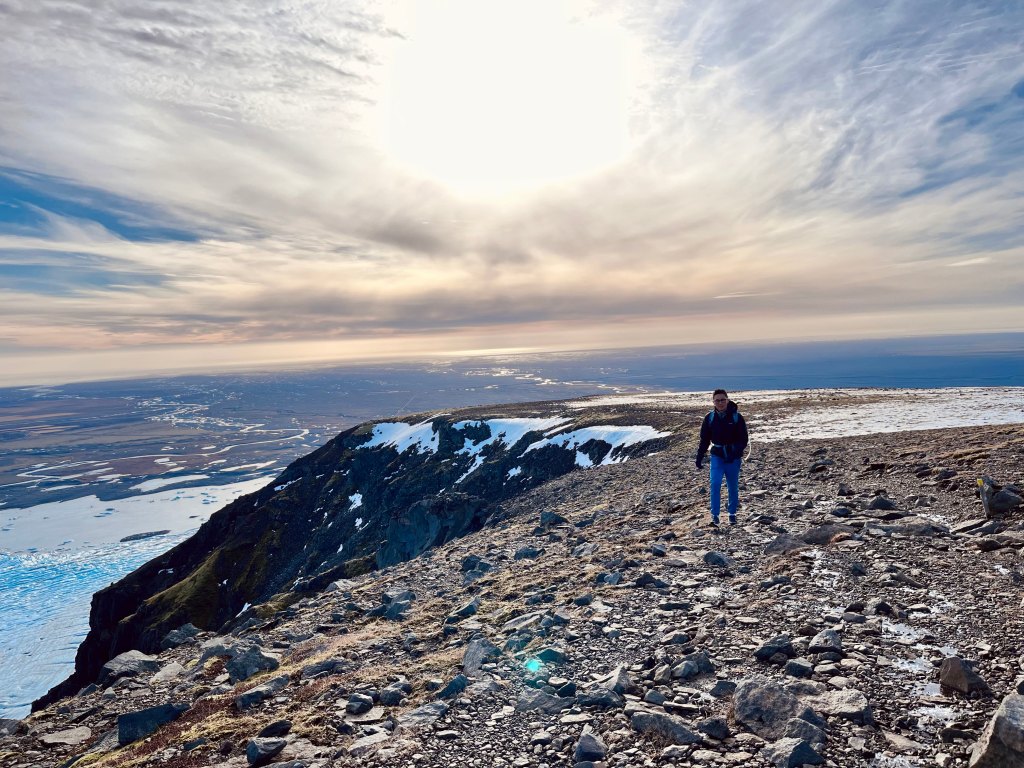 1. Hiked the Snaefellsjökull trail along the cliffs until 3 pm. Turned around to hike to big rocks (Lóndrangar basalt cliffs) until dark.