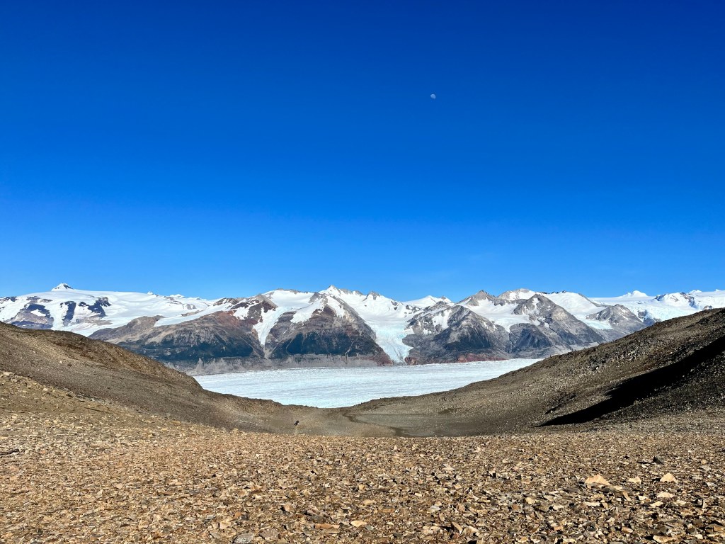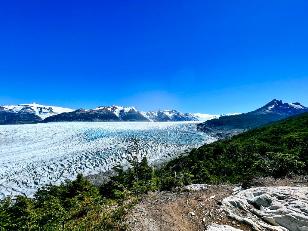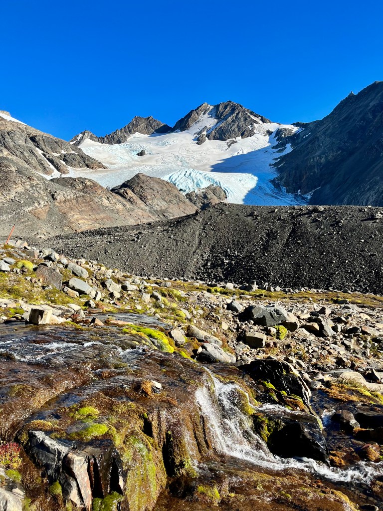 At this point, it was 9:30 am. I looked out, and a massive mountain with wispy clouds at its summit and a sparkling white glacier in its valley stood before me. I asked a man to take my photo before finally stepping onto the trail.